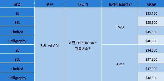 <표: 2022MY 팰리세이드 모델별 파워트레인 및 MSRP>