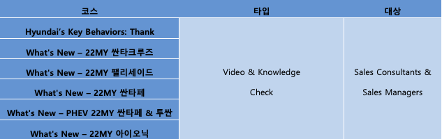 6월에는 현대자동차를 대표하는 현대자동차의 첫 번째 픽업 모델인 2022MY 싼타크루즈를 비롯해 2022 팰리세이드와 싼타페 등에 대해 소개하는 코스들이 준비되어 있습니다.