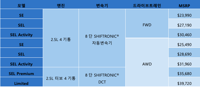 이와 함께 무선으로 테일게이트를 여닫을 수 있을 뿐 아니라, 짐의 종류에 따라 테일게이트가 열리는 정도를 조절할 수 있어 편의성도 갖추고 있습니다. 연비는 21/27/23MPG (시내/프리웨이/복합, AWD 2.5L)이며, 토잉 능력은 최대 5,000lb.(AWD 2.5T)입니다.