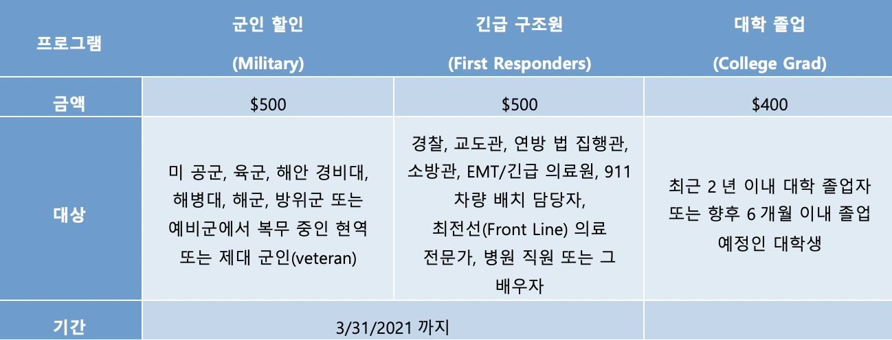 현대자동차는 커뮤니티에 봉사하는 군인이나 경찰, 소방관 및 응급 구조요원과 이제 사회에 막 진출하는 대학 졸업자/예정자들을 위한 스페셜 오퍼를 제공하고 있습니다. 프로그램에 대해 보다 자세한 사항은 웹사이트에서 확인할 수 있습니다.