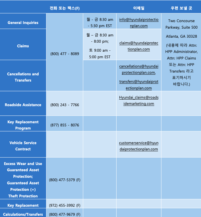 현대자동차는 ‘미국 최고의 워런티’ 프로그램에 더해 차량을 더욱 광범위하게 보호해주는 ‘현대자동차 차량보호플랜(Hyundai Protection Plan·HPP)’을 운영하고 있습니다. 하지만 HPP를 구입한 고객이 차를 한국으로 가지고 가거나, 다른 사람에게 양도/판매할 때, 또는 폐차시킬 때는 더 이상 HPP가 적용되지 않습니다. 이에 대해 문의해올 경우 다음 내용과 연락처를 참고하여 안내해주시기 바랍니다.