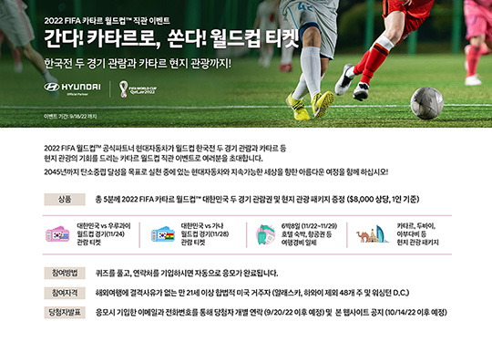 현대자동차 미국판매법인은 미국 내 한인 소비자 여러분께 월드컵 공식 파트너로서 현대자동차 브랜드의 이미지 및 선호도를 제고하기 위해 ‘2022 FIFA 카타르 월드컵™ 직관 이벤트’를 진행합니다.