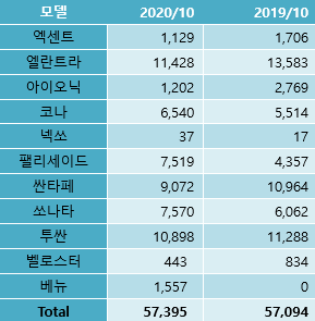 HMA는 10월 총판매량이 5만7,395대를 기록해 작년 같은 달에 비해 1% 늘었고, 소매 판매는 5만2,117대로 10% 증가했다고 밝혔습니다.