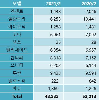 현대자동차(HMA)의 2월 판매량이 4만8,333대로 지난해 같은 기간보다 9% 줄었습니다.