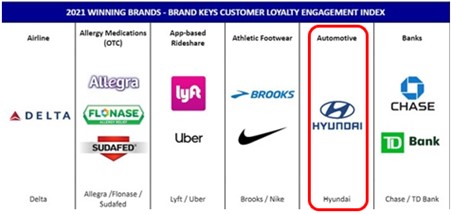 현대자동차가 브랜드 컨설팅 전문업체 ‘브랜드 키즈(Brand Keys)’가 발표한 ‘2021 고객 충성도 조사(Customer Loyalty Engagement Index®)’에서 자동차 부문 1위에 올랐습니다. 이번 조사에 현대자동차는 브랜드에 대한 고객의 감정적 일체감이 높고, 제품이 고객의 기대를 충족시키는 수준이 높은 것으로 확인됐습니다.