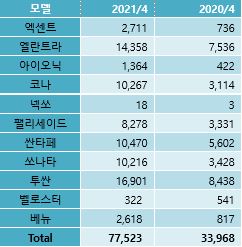 현대자동차, 4월 77,523대 판매