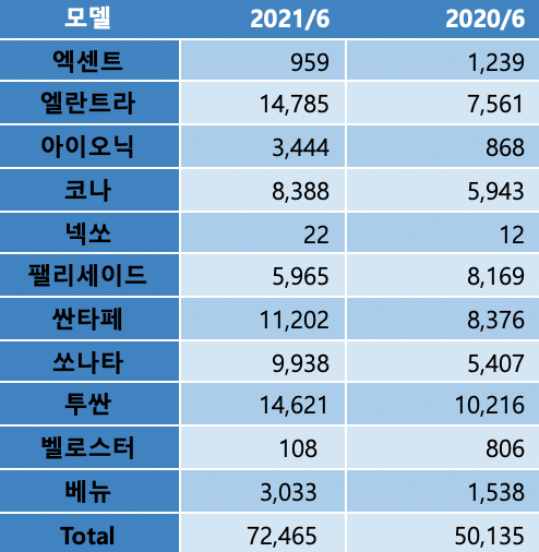 6월에 가장 많이 판매된 차종은 엘란트라(1만4,785대)였고, 투싼(1만4,621대), 싼타페(1만1,202대) 등이 뒤를 이었습니다.