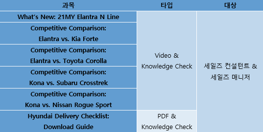 세일즈 담당자 여러분의 차량에 대한 이해도를 높여주는 11월 STAR 인증 코스가 진행되고 있습니다. 추가된 과목들은 엘란트라와 코나를 경쟁차량과 비교한 것들로, 세일즈 컨설턴트와 매니저 여러분께서는 오는 30일까지 해당 과목을 수료하셔서 STAR 인증을 유지하시기 바랍니다. 아직 9~10월 코스를 수강하지 않으신 분들은 이를 마쳐야 11월 코스 수강이 가능합니다.