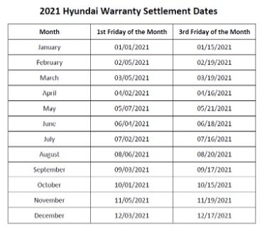 2021년 Warranty Settlement Dates가 Hyundaidealer.com을 통해 공지되었습니다. 일정은 매달 첫 번째 금요일과 세 번째 금요일이며, 관련 내용은 웹사이트에 들어가 ”Service tab ->Dealer Resources -> Documents Library -> Warranty” 순으로 클릭하시면 확인할 수 있습니다.