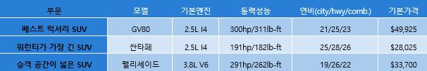 로드쇼는 SUV를 총 6개 부문으로 나눠 각 부문의 최고 모델을 선정했으며, GV80와 싼타페, 팰리세이드는 ▲베스트 럭셔리 SUV ▲워런티가 가장 긴 SUV ▲승객 공간이 가장 넓은 SUV 부문에서 각각 최고의 모델로 추천받았습니다.