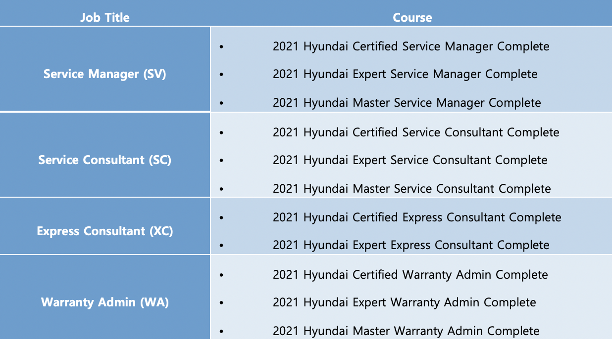 서비스 분야의 ‘비기술적(non-technical)’ 트레이닝은 ▲Certified ▲Expert ▲Master 등 3단계로 구별되는데, 12월 31일까지 “2021 Hyundai Complete Course”를 마치지 않으면 내년부터 인증 레벨이 다음 단계로 하향 조정되어 Star Awards 자격 요건에 영향을 미치게 됩니다.