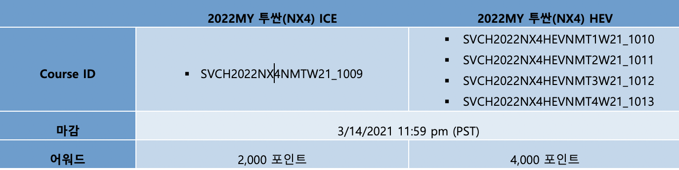 <표: 2022MY 투싼 관련 코스>