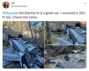 필즈는 트위터에 “현대 엘란트라 N은 정말 훌륭하다”며 “300피트 아래 떨어져서도 나는 살아남았다”고 전했습니다.