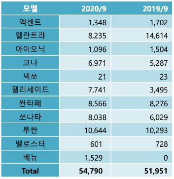 <표: 2020년 9월 현대자동차 판매>