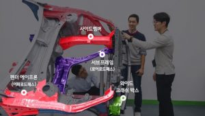 보통 ‘멀티 로드 패스 바디 구조’라고 합니다. 일반적으로 사고가 나면 사이드 멤버에 충돌 하중이 집중됩니다. 사이드 멤버란 보닛을 열면 보이는 엔진룸 양쪽을 지지하는 골격 구조물입니다. 다중골격 구조는 이 프런트 사이드 멤버뿐 아니라 서브 프레임, 펜더 에이프론 등을 유기적으로 잘 엮어서 충돌 하중이 여러 경로로 흡수, 분산되도록 한 구조를 말합니다.