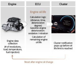 • 엔진 데이터와 운전자 주행 패턴을 분석하여 엔진오일의 잔여 수명(Remaining Life)을 자동으로 계산하고 경고 알람을 통해 엔진오일 교체 주기를 알려줍니다.