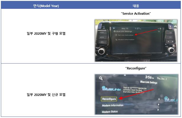 블루링크를 설정하고 처음 작동할 때 사용하는 “Service Activation” 버튼이 2020년형(MY) 일부 모델부터 “Reconfigure”로 명칭이 변경되었습니다. 고객에게 블루링크 서비스를 안내하실 때 참고하시기 바랍니다.