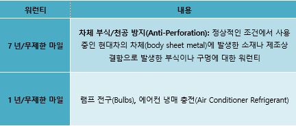 미국 최고의 워런티를 자랑하는 현대자동차는 파워트레인(10년/10만 마일), 신차 워런티(5년/6만 마일) 외에도 다음과 같은 특별 워런티를 제공하여 고객이 안심하고 운행할 수 있게 합니다.